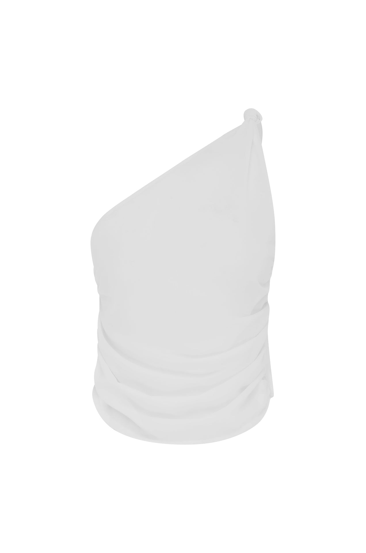 The Gabriella is a sheer one shoulder top with a knot feature on the strap, with side pleating.