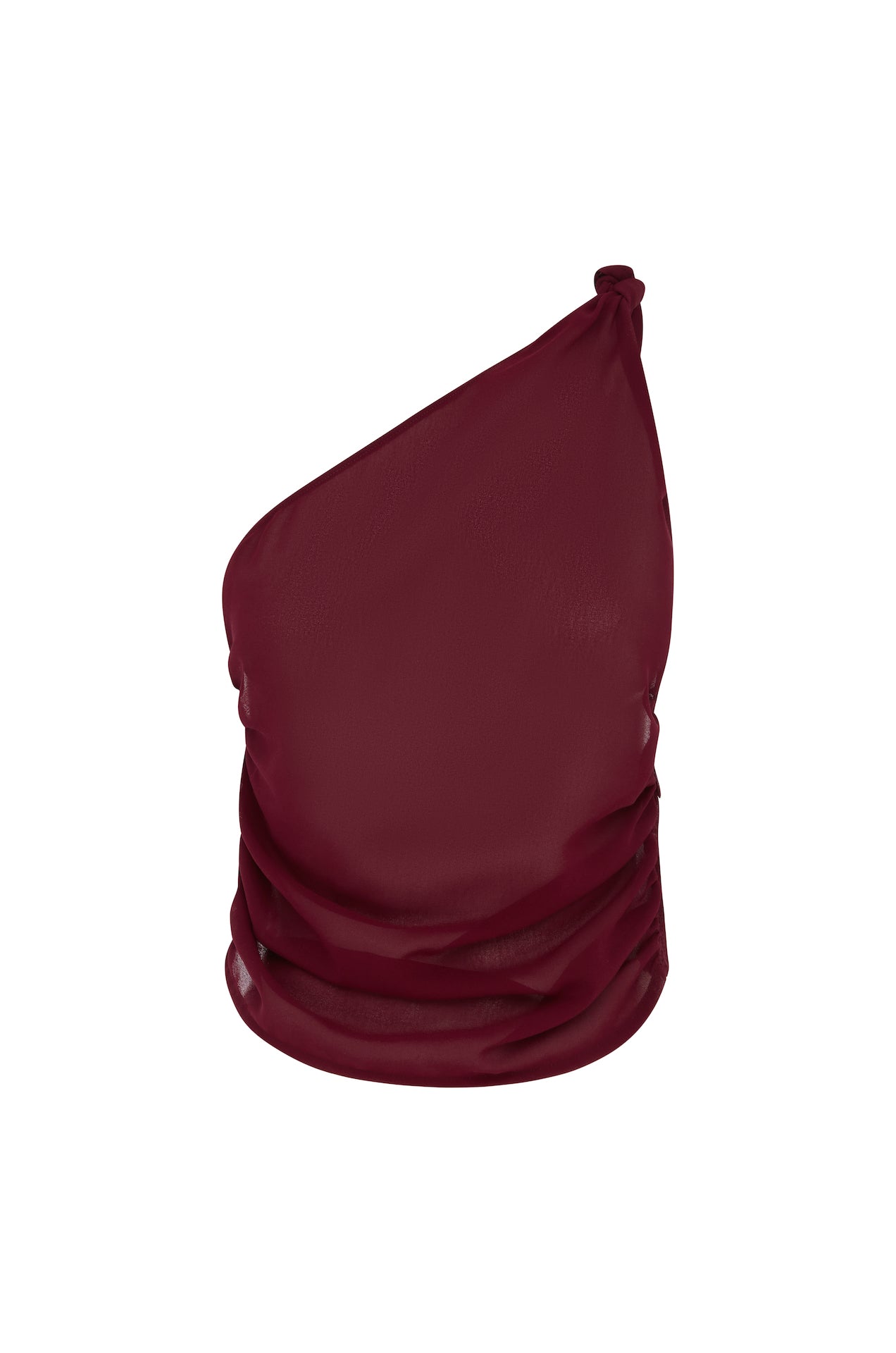 The Gabriella is a sheer one shoulder top with a knot feature on the strap, with side pleating.