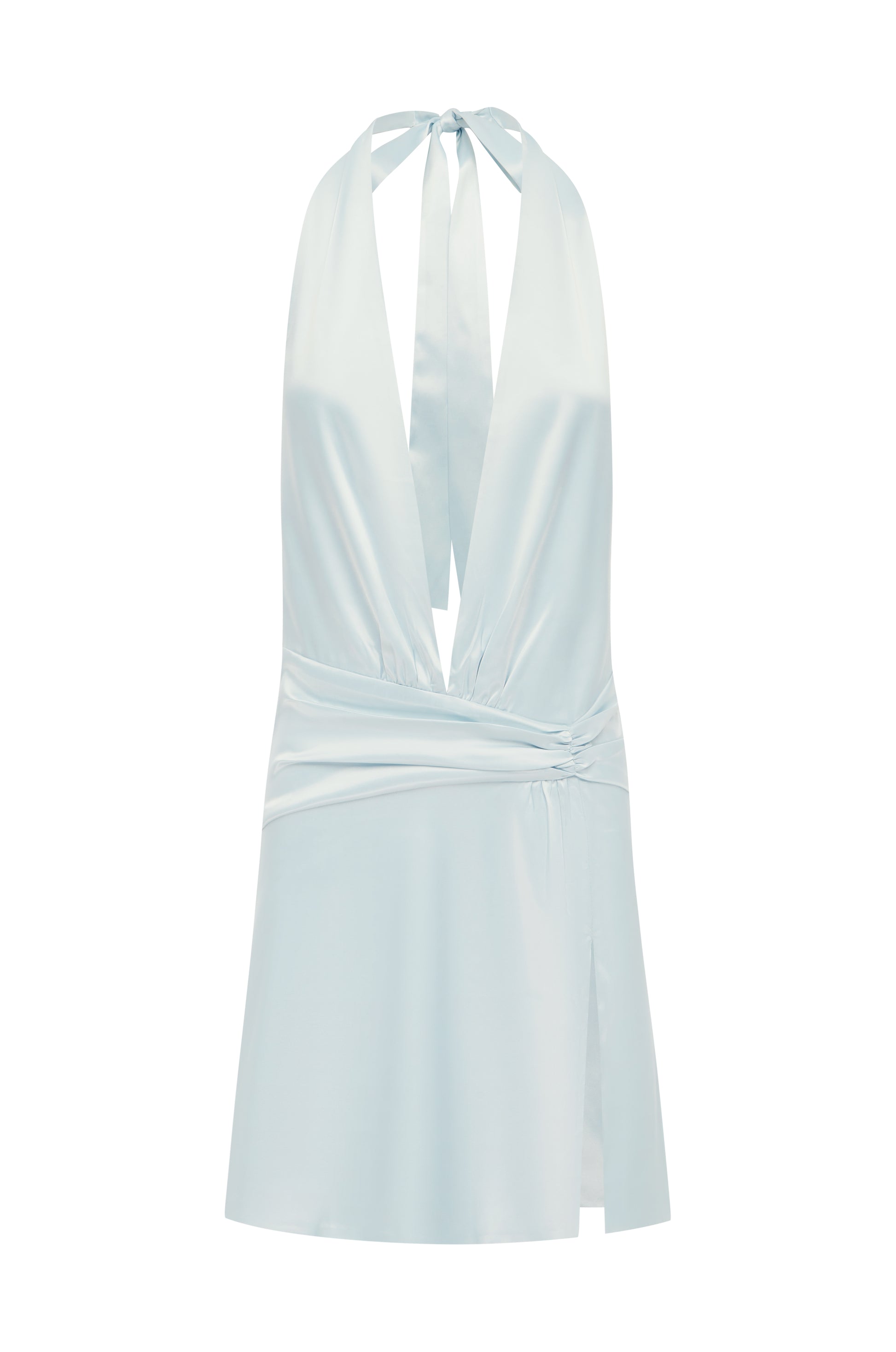 Slip into a pure 90s supermodel energy with this ice blue V-cut dress, crafted in a buttery, silky-smooth fabrication that glides against the skin.